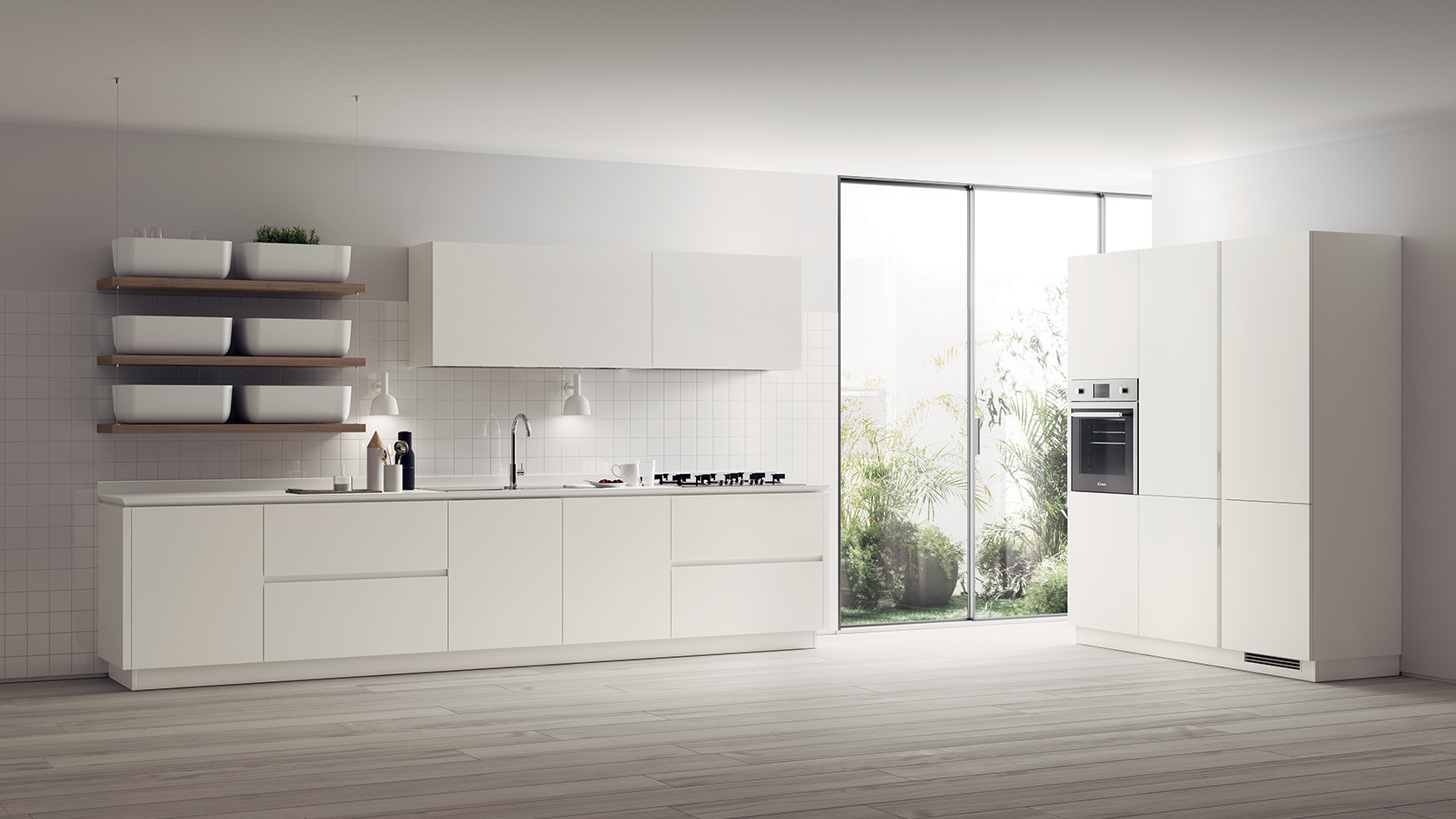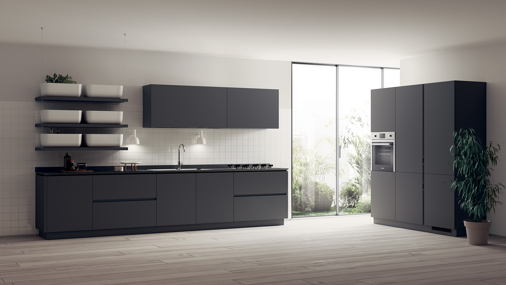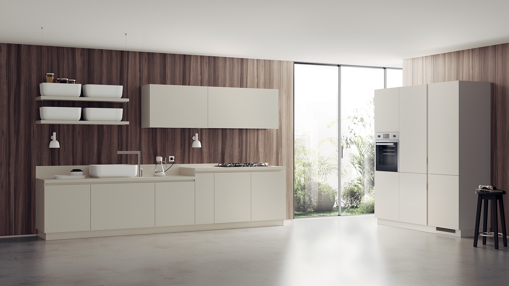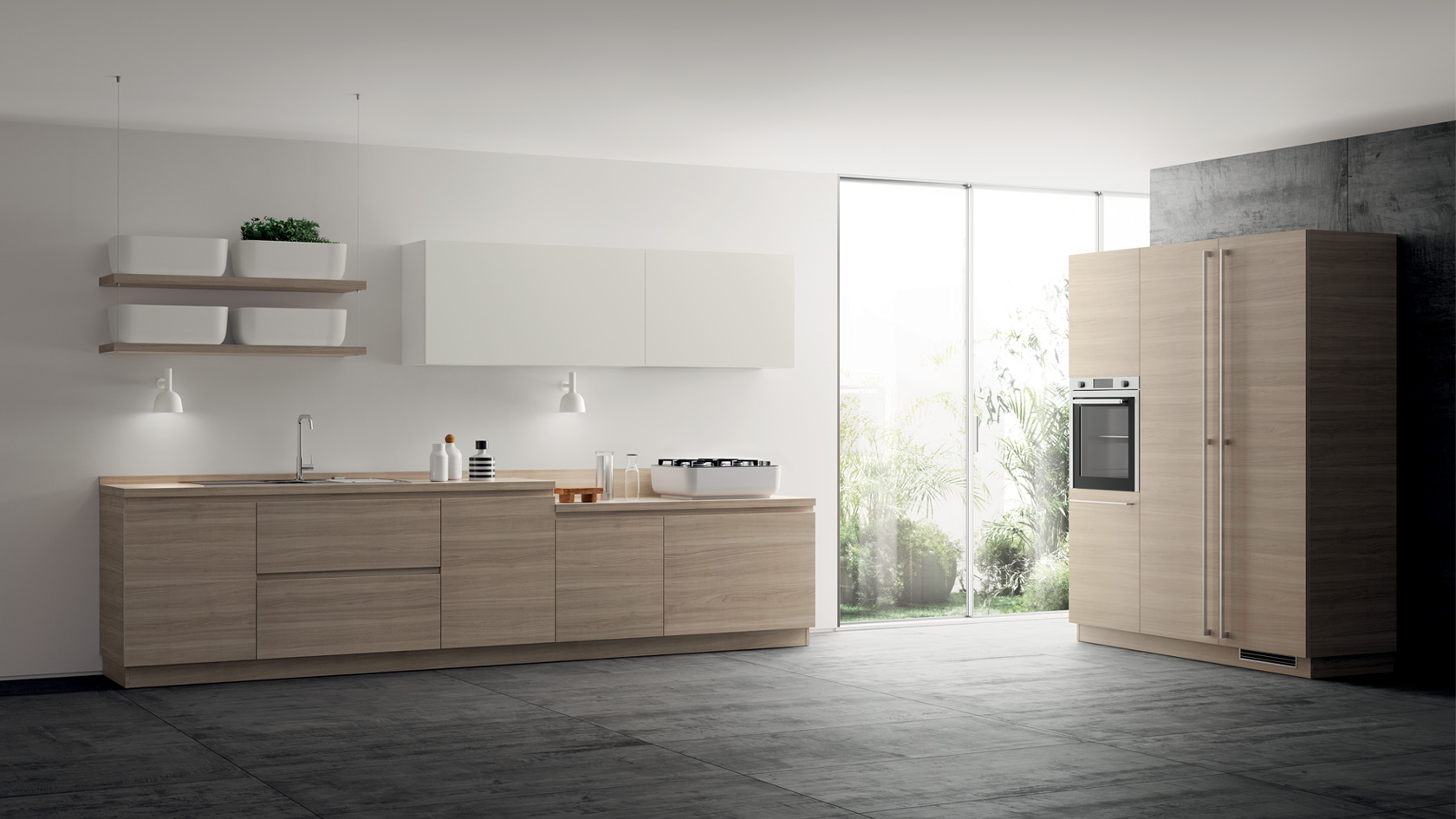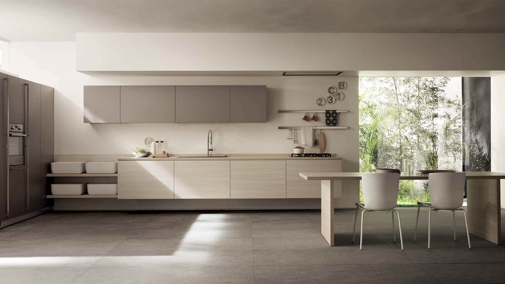 Pentru acest nou model Scavolini, a fost selectată o gamă exclusivista de melamine decorative, moi la atingere, cu două nuanțe cu efect de lemn de ulm (Hono Elm și Kuuki Elm), un amestec intre măiestria expertilor și cea mai recentă tehnologie.